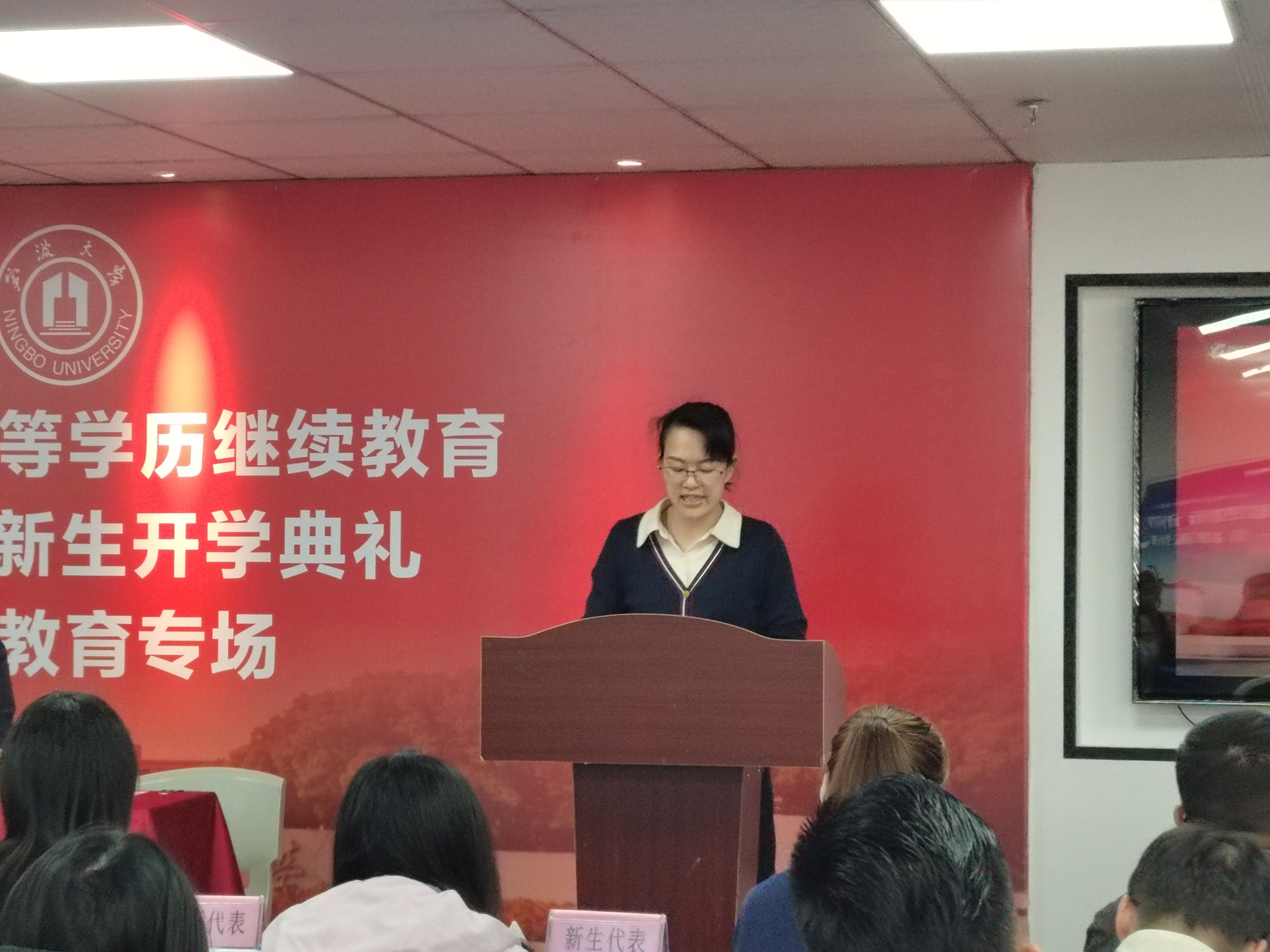 宁波大学育成教学点辅导教师俞建萍老师上台发言。俞老师娴静温婉、平易近人,深受广大师生喜爱与认可。她将以耐心细致的陪伴、专业悉心的指引,助力各位新同学快速融入浓厚的学习氛围。相信在俞老师与全体教师的陪伴下,新生定能逐梦前行、学有所成!